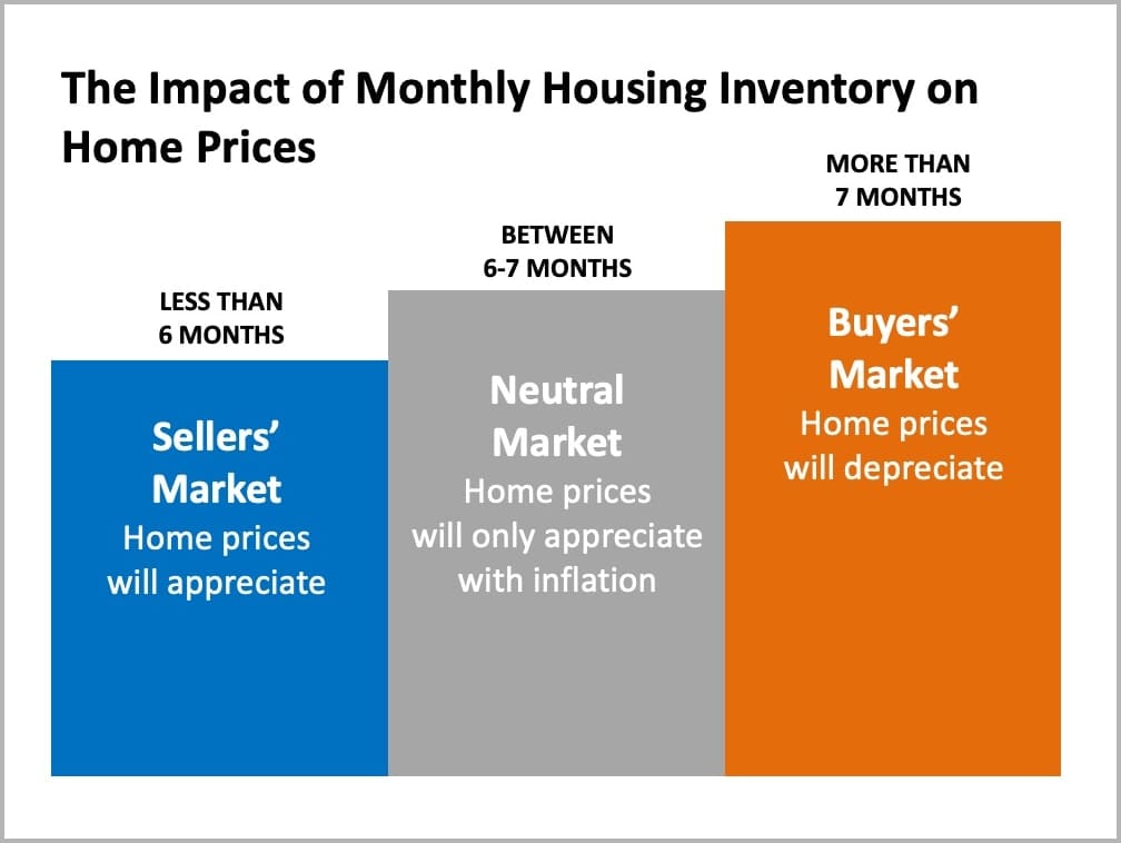 Historically, a 6-month supply is necessary for a ‘normal’ or ‘neutral’ market, in which there are enough homes available for active buyers (See graph below):