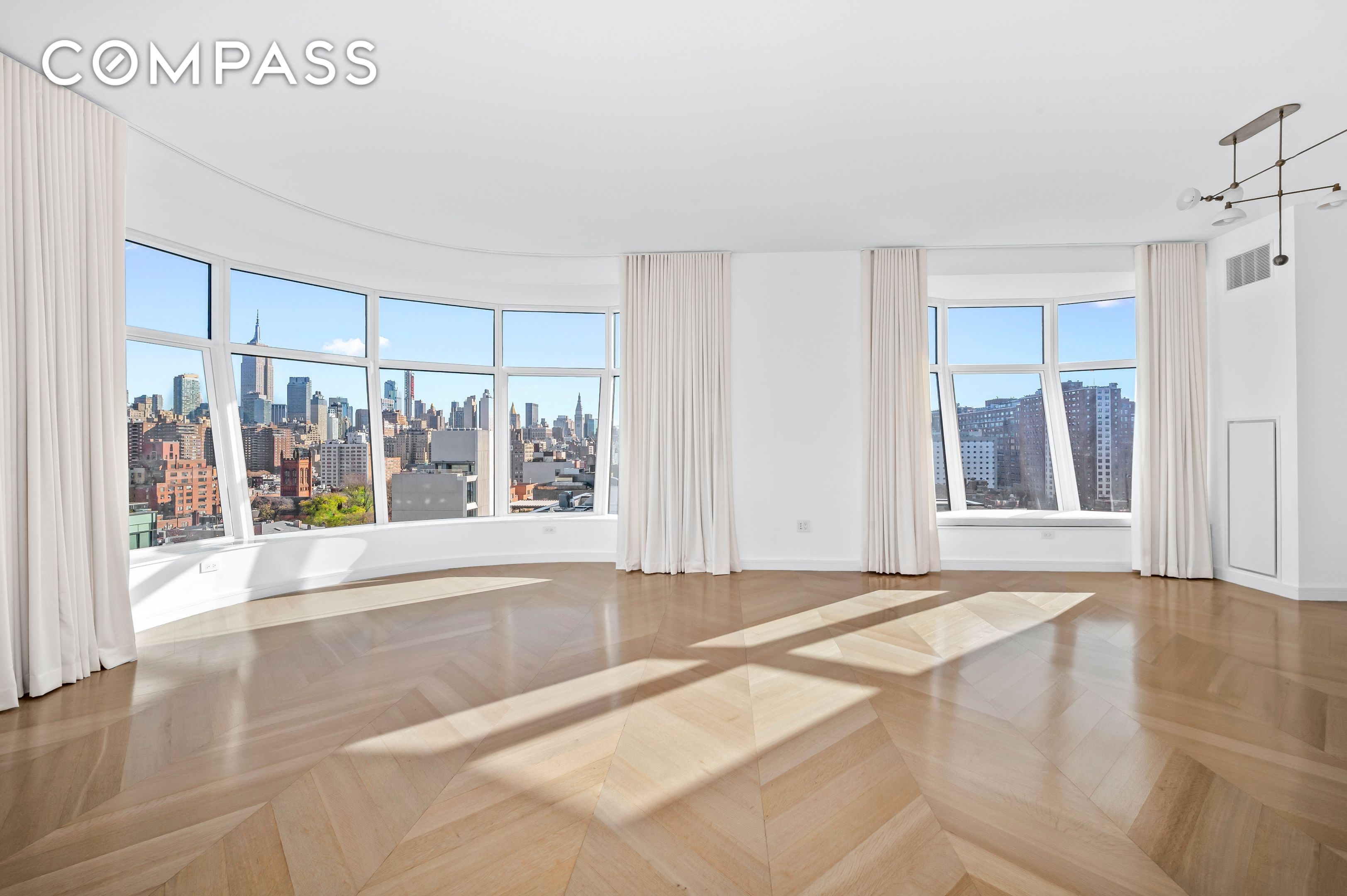 This expansive three-bedroom, 3.5-bathroom home enjoys breathtaking north and east exposures that showcase sweeping views of Manhattan's iconic skyline. Enter through a gracious foyer that seamlessly opens into an oversized living and dining room, offering an inviting space for relaxation and entertainment.